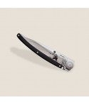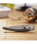 Couteau ultra léger en acier inoxydable Z40C13, finition titane gris. Lame avec cran de sécurité de type 'liner lock' décorée d'une fine gravure au laser. Clip de ceinture. Manche en Ebène.